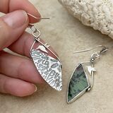The pattern on these Ruby in Zoisite stones drove this design. Most of the stones are green zoisite with a sweet spot of dark pink ruby at each tip. I envisioned a pink flower and hand-saw-cut hummingbirds from sterling silver to complete the 'scene'. I added a botanical pattern to the backs of the bezel settings and sterling silver leaves to the handmade ear wires to complement the theme. Patina'd with highlights polished.