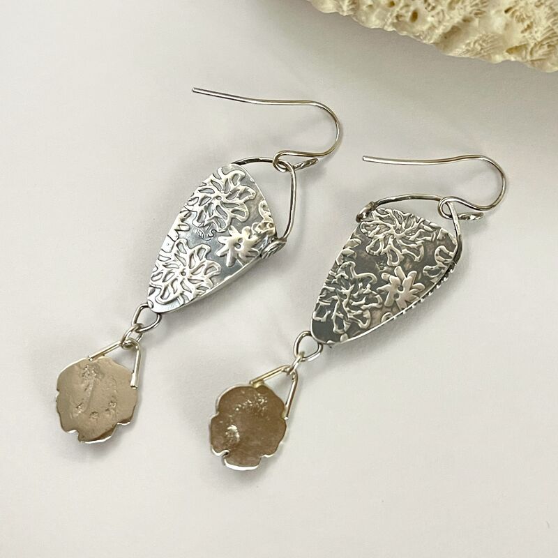 To make these earrings, I started with sheet sterling silver and wire. I made a bezel cup setting for the mirror-image triangle-shaped Ocean Jasper stones and accented it with 'bead' wire along one edge. On the reverse of the bezel cup, I embossed a flower design so these are pretty on the back too, which is especially nice if you have short hair or wear your hair up. I made the flower dangle by first hammering a blob of sterling silver into a form. After cutting out the flower with my saw, I soldered a detail into the center.