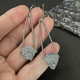 The star of these earrings is a pair of color-matched, but mis-matched shape, natural turquoise mined in Kingman Arizona. I gave these a long, simple, setting by dangling them from twist wire and a added a geometric pattern to the back of the bezels so they are pretty even from the back with a short or 'up' hairstyle.