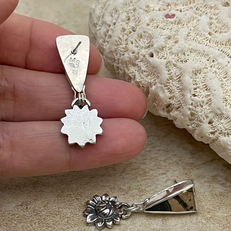 Ocean Jasper stud dangle earrings, handcrafted by me in sterling silver, featuring solid sterling silver flower dangles. To make the flowers, I first melted scrap bits of silver to form a ball, then hammered the silver into a flower mold. The final step was to saw out the flower impression and polish the edges and reverse.